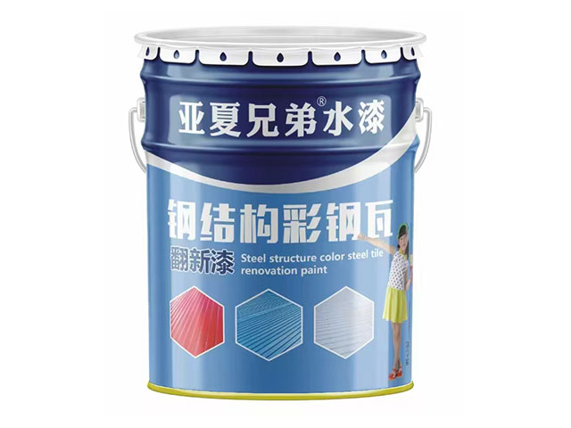 亚夏兄弟钢结构彩钢瓦翻新漆系列产品,选用高性能水性树脂,优质填料、添加剂制成。本产品以水为稀释剂,对基层的附着力强,光泽度高,涂刷面积大,易施工等优点,广泛应用于各种彩钢瓦、网架、钢结构、钢材设备等防腐保护。